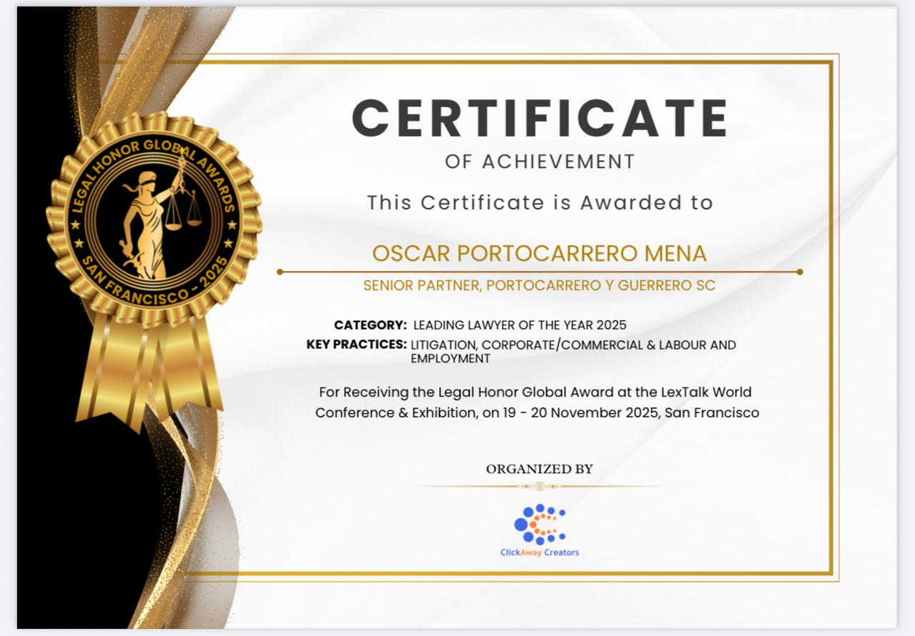 Premio como Abogado Líder del Año 2025 a nivel mundial en los Legal Honor Global Awards Áreas Litigio, Derecho Corporativo y Derecho Laboral